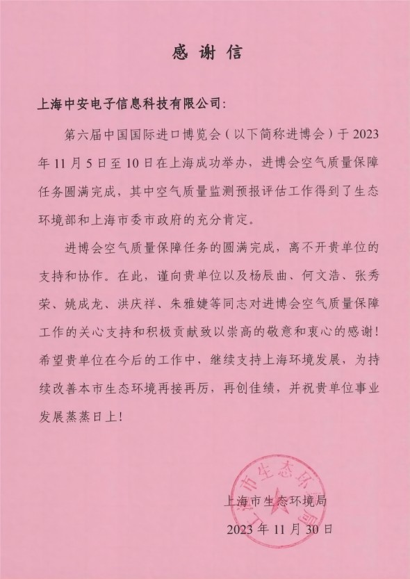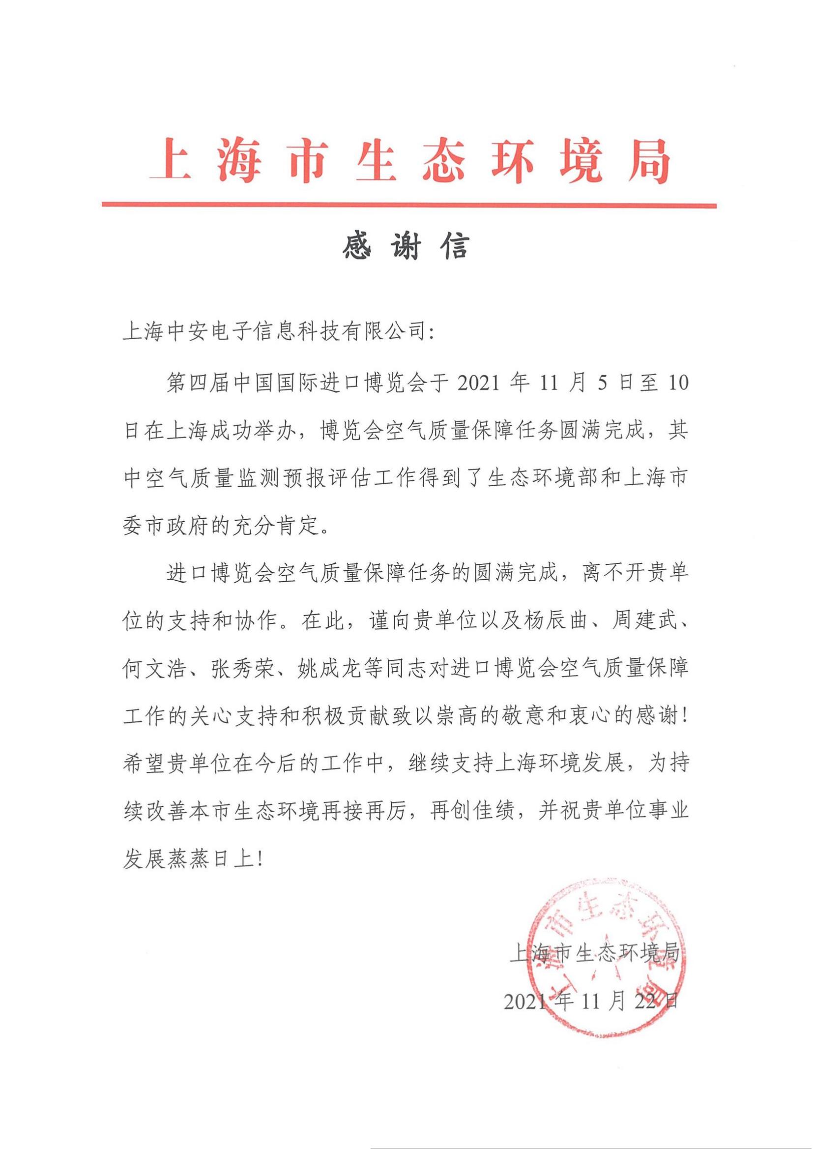 上海環監中心就中安科技在21年國際進博會空氣質量監測預報工作中杰出貢獻送來感謝信?。?021/12/31)